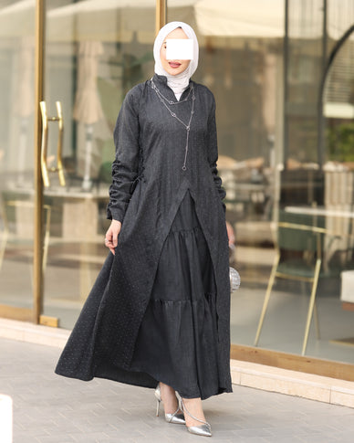 دراعه كتان قطعة واحدة مصممة لأناقة يومية سهلة. مصنوعة من كتان قابل للتنفس بلون أسود عميق مع ملمس منقط خفيف، ومزودة بتصميم أمامي متعدد الطبقات وسيلويت فضفاض يتحرك بشكل جميل.