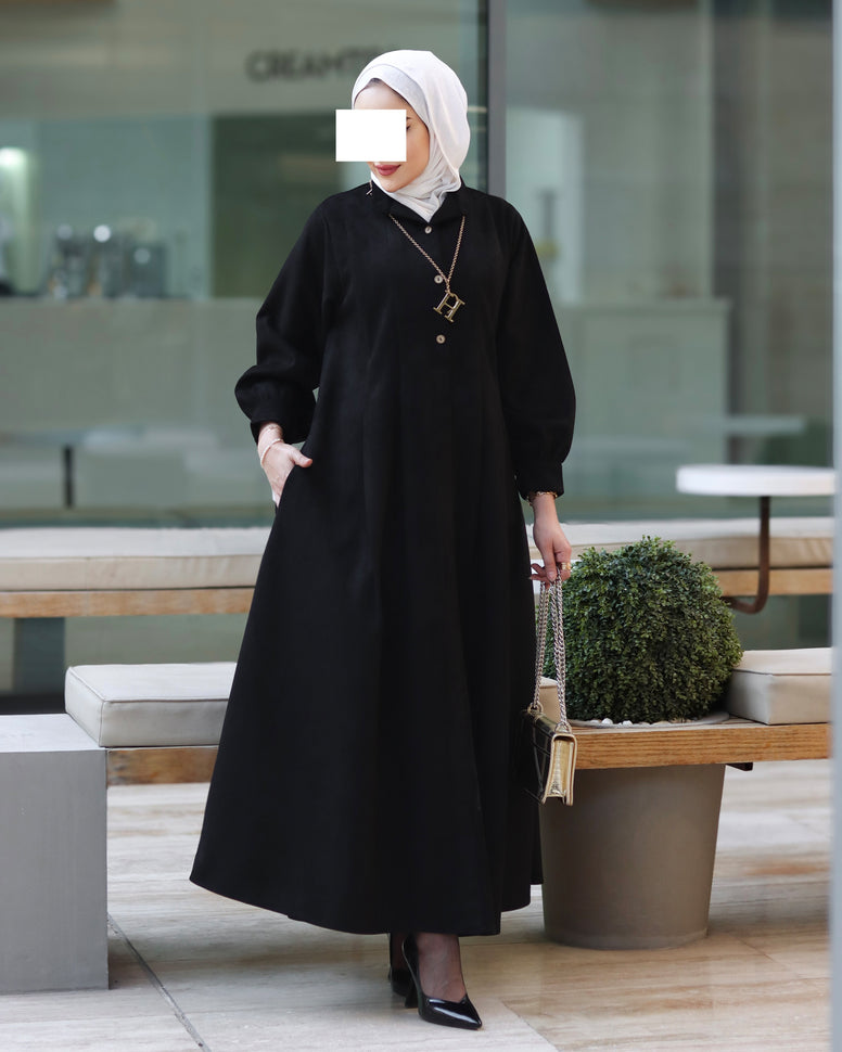 A soft-chamois A-line nafnouf with a clean, modest silhouette. The design features a simple button detail and relaxed sleeves for an easy, everyday fit. The black shade gives it a polished, versatile look that works for outings, work, or simple evening wear. Smooth, comfortable, and effortlessly elegant.