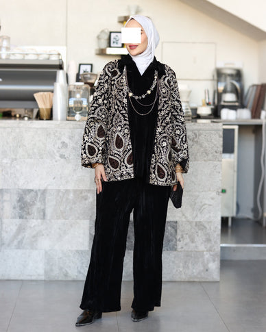 A refined 3-piece velvet set designed for elevated occasions and elegant evenings. This set features a tailored embroidered velvet jacket layered over a matching inner top and straight-cut pants. The intricate silver embroidery adds depth and contrast to the rich black velvet, creating a powerful yet graceful look that balances structure with fluidity.